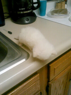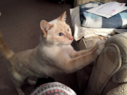 Hi, my name is Cosmo! I got my name from some of my Mom’s little humans (they call her grandma). One of them, Victoria, insisted that they rescue me when she saw me in a box when she came to learn to dance. I was only 3 weeks old, itchy from those things biting me all the time and scared to be in a building with people!