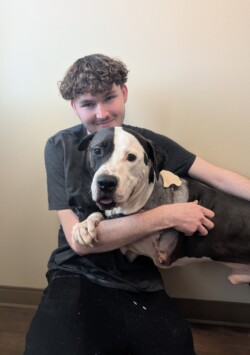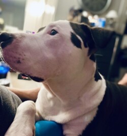 He’s silly and always has me smiling and laughing. I love the way he turns and tilts his head while I’m talking to him. It’s like he’s really listening and cares. He knows when I just need a hug. He will just come give me a hug or just plop right on my lap. He’s 78 pounds but thinks he’s 5 pounds. But he’s just so darned sweet.