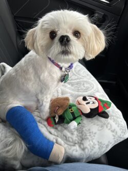 I was panicked when her foot got caught in her sweater so she landed wrong when she rolled off the bed. She was obviously in lots of pain. And then when our vet said her leg was severely broken and she’d need to see a surgeon to get it repaired, I cried.