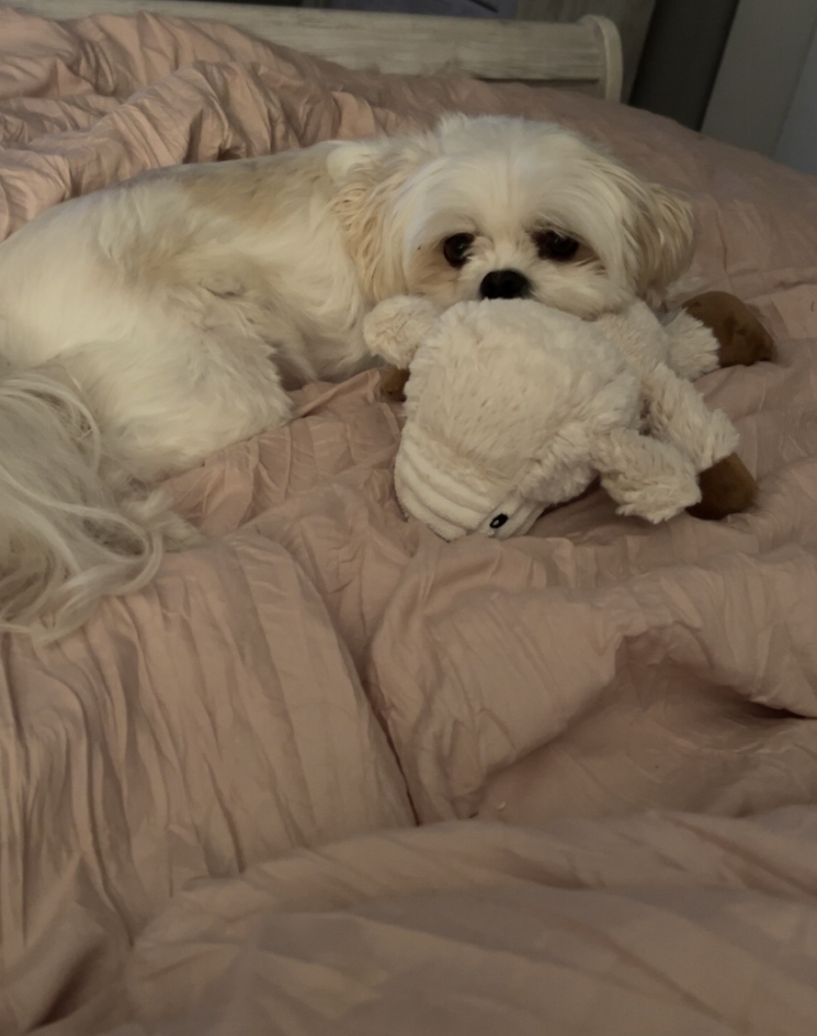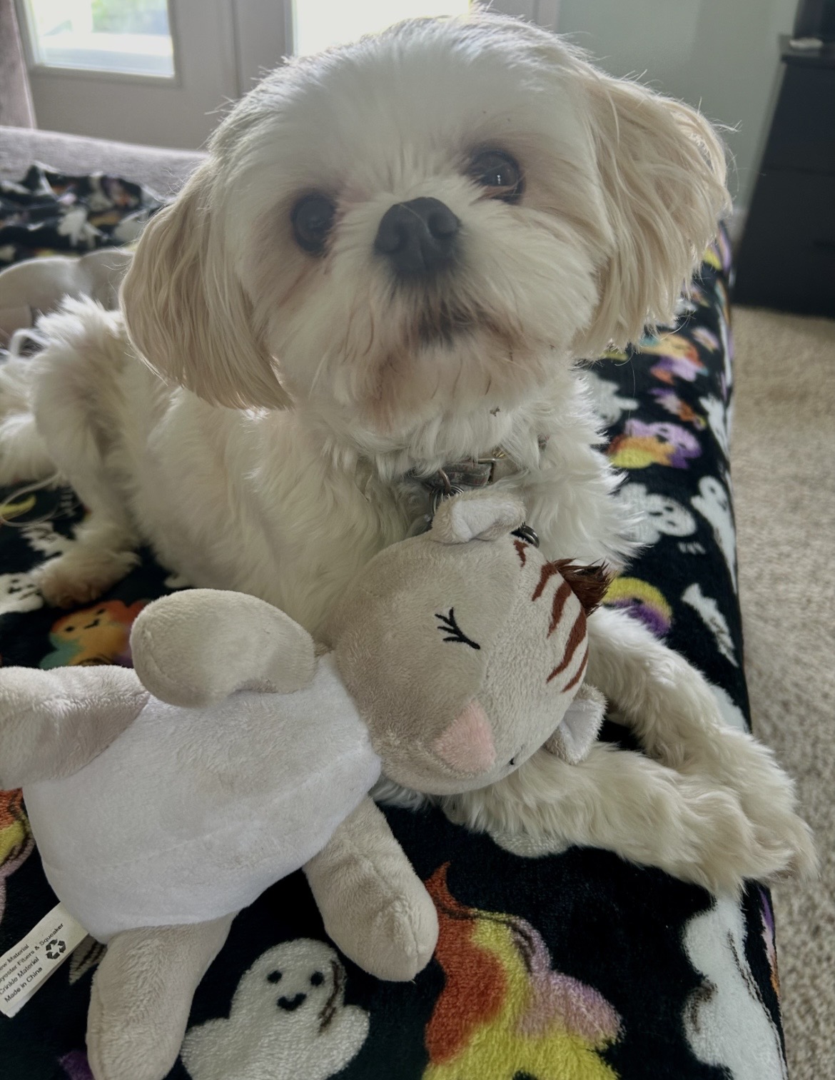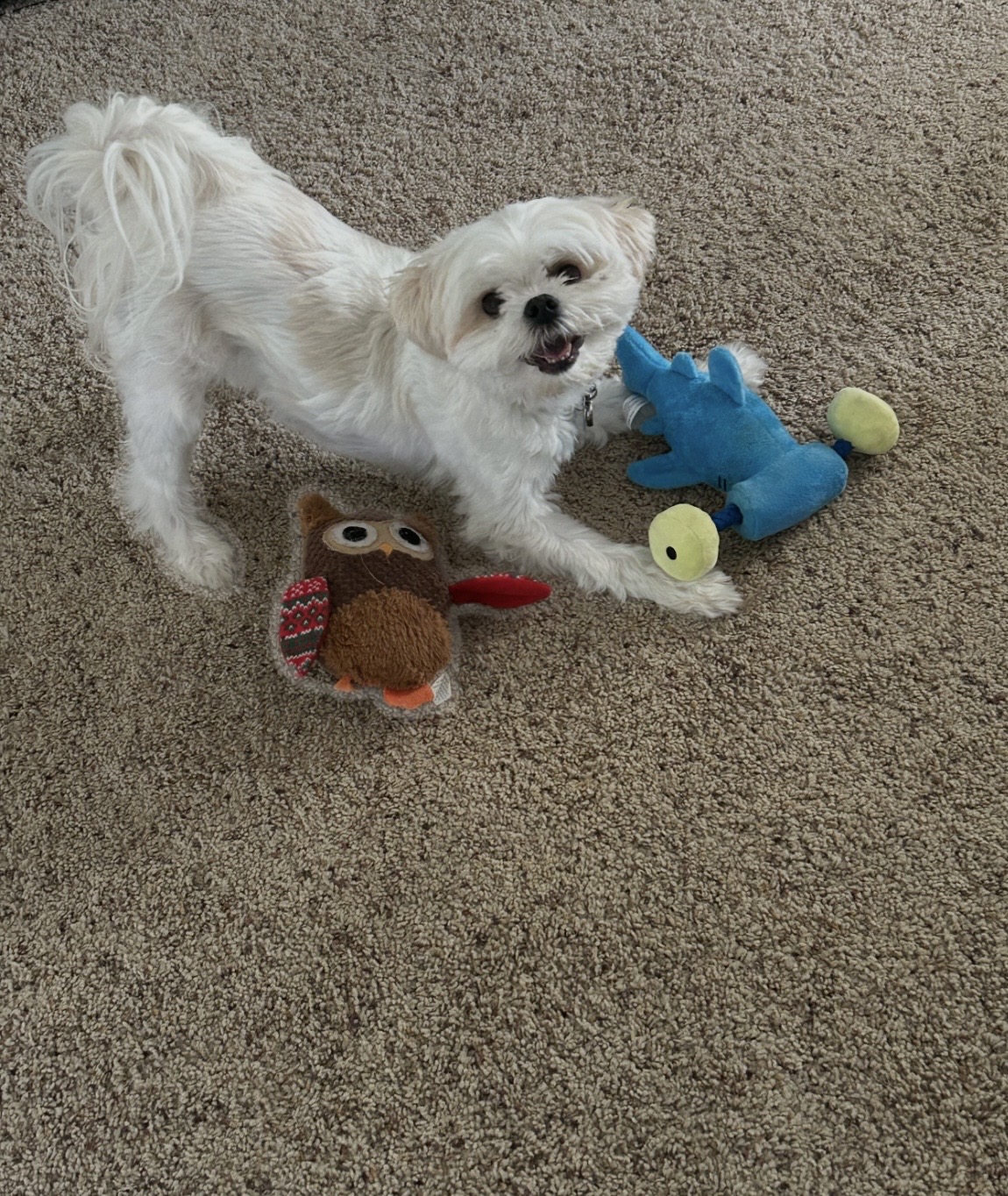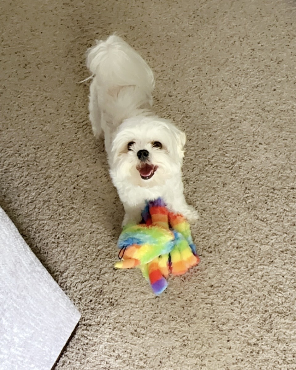 I’ll never forget the first time I brought her on the couch to cuddle me. She freaked out. She hadn’t been allowed on the couch in her last home. She’d never had a toy before either. You should have seen the amazement in her eyes when we first brought her home. My daughter dumped a whole container of dog toys around her. Once she understood she could, she tried the squeakers in every toy. She still makes me laugh when she proudly carries around lambchop (her favorite!)